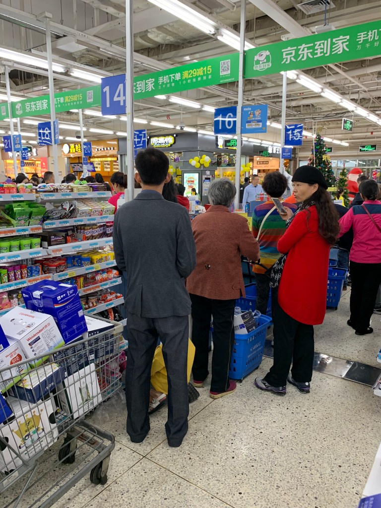 So nothing unusual here. Just like any other Walmart you say? This is true until you decide you are done on this floor and are ready to go to the check-out downstairs. You access the lower floor by taking a flat escalator. As you go down the escalator the noise from the floor below gets louder and louder and louder. By the time you reach the lower floor, which is the grocery department, you can scarcely hear yourself think. It’s a very good thing that Dave is tall because he wove his way through the throng and I followed him. I stopped a few times to take a picture which probably wasn’t the best idea as I would lose him. But he is easy to see in a crowd and we eventually made it to the check- out line or should I say lines?