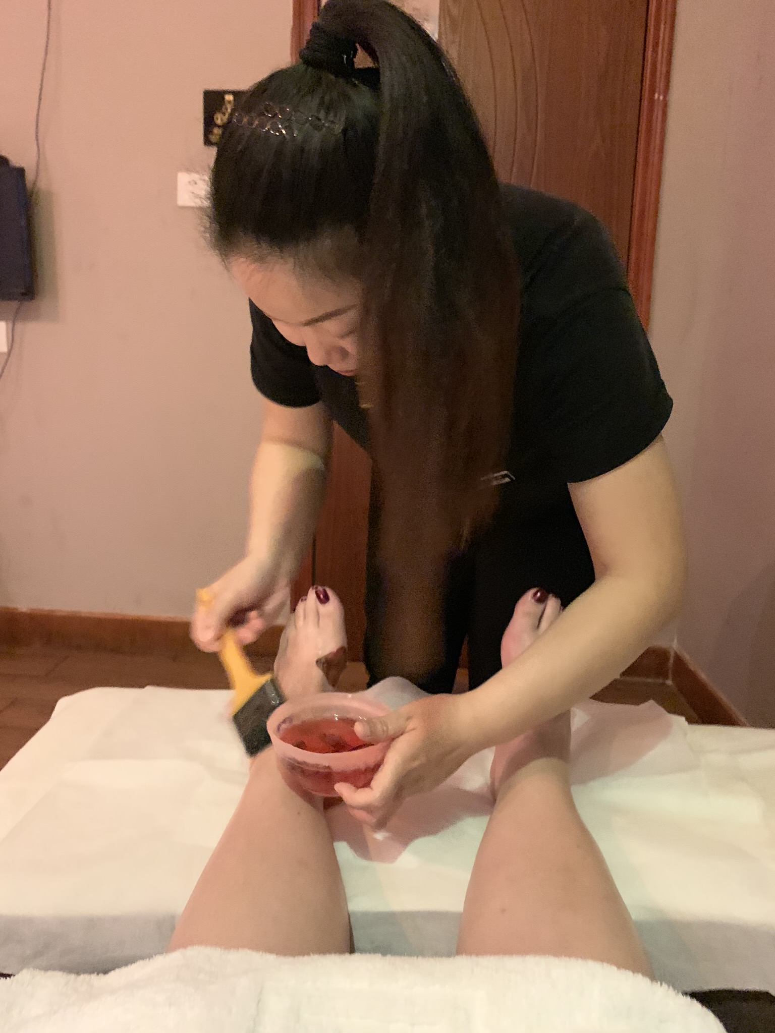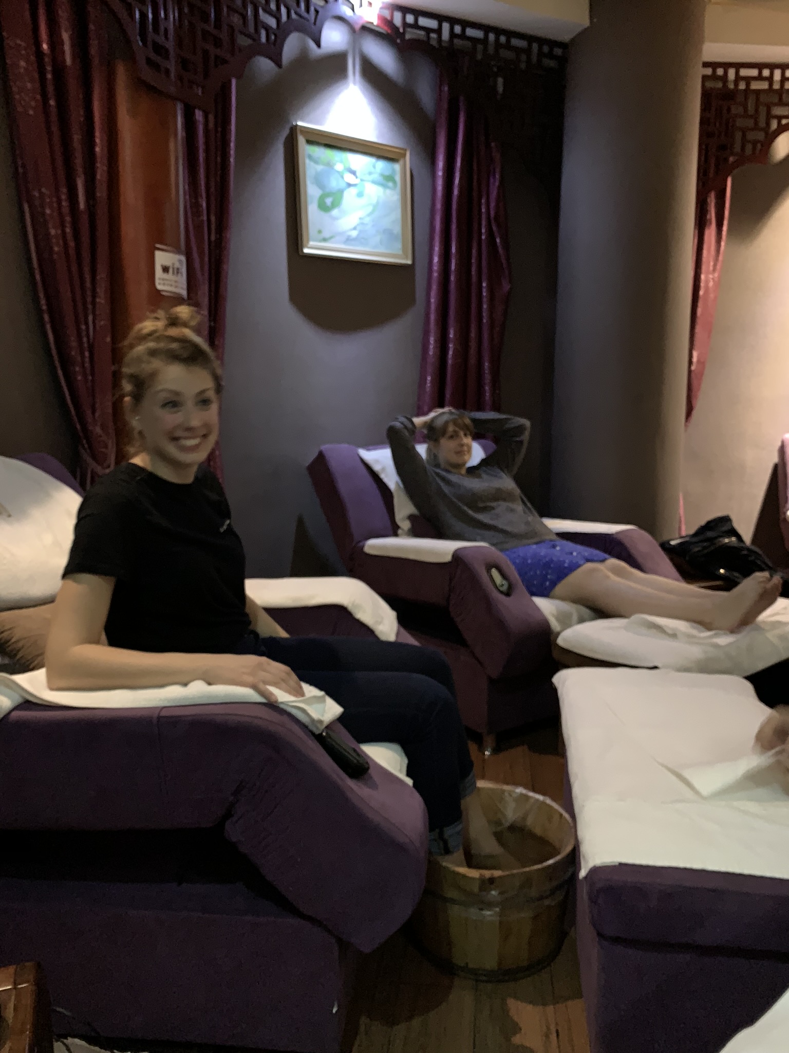 After logging a lot of steps through the park we made our way back to Sea World where we all had a Chinese foot massage. This particular massage involves soaking your feet in a little wooden bucket, a back,/neck/shoulder rub through your clothes, a foot massage followed by warm paraffin wax being painted on your feet. You get to relax in a lazy boy recliner while they work on you. So five of us in the same room with five people massaging your feet…nothing awkward about that! The masseuses asked us questions about who we were and we did manage to convey that we were a family and the birth order of the kids. I can only imagine what they were chatting about while they worked on us.