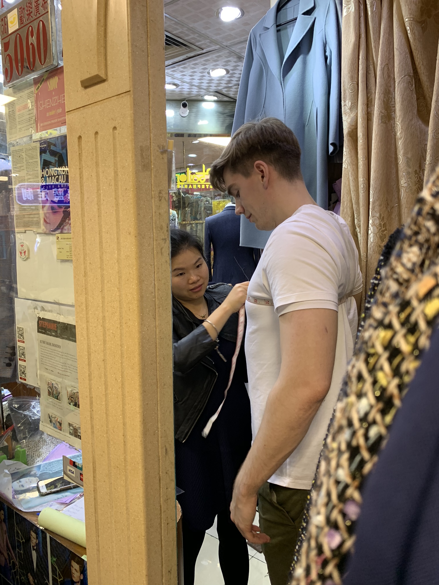 First you have to get measured and Cam barely fit in their stall! He got three three shirts, the one in the middle has moose on it, an ode to his Canadian heritage. Courtney got a ‘Chanel’ jacket and three skirts. A ‘Chanel’ jacket is ‘must have’ on people’s list and is on my list too. Holly got two pairs of pants and a dress. All for cheap like borscht but very well made. I know I will be spending a lot of time here!