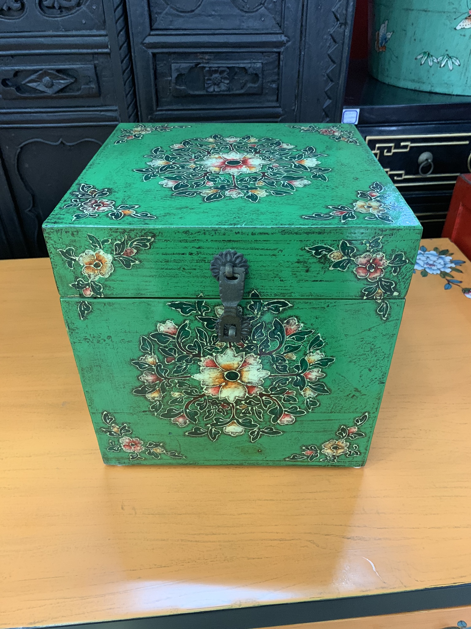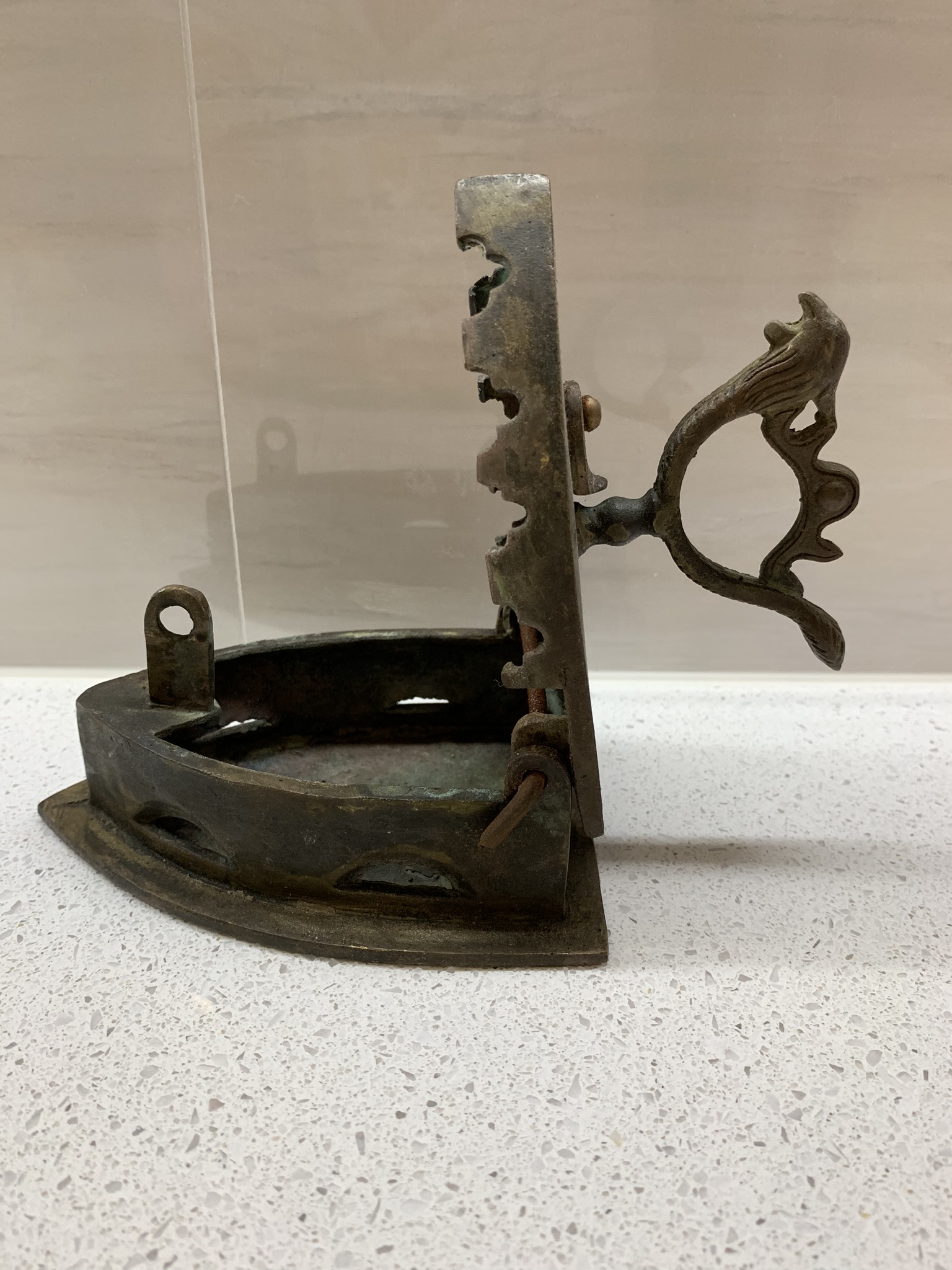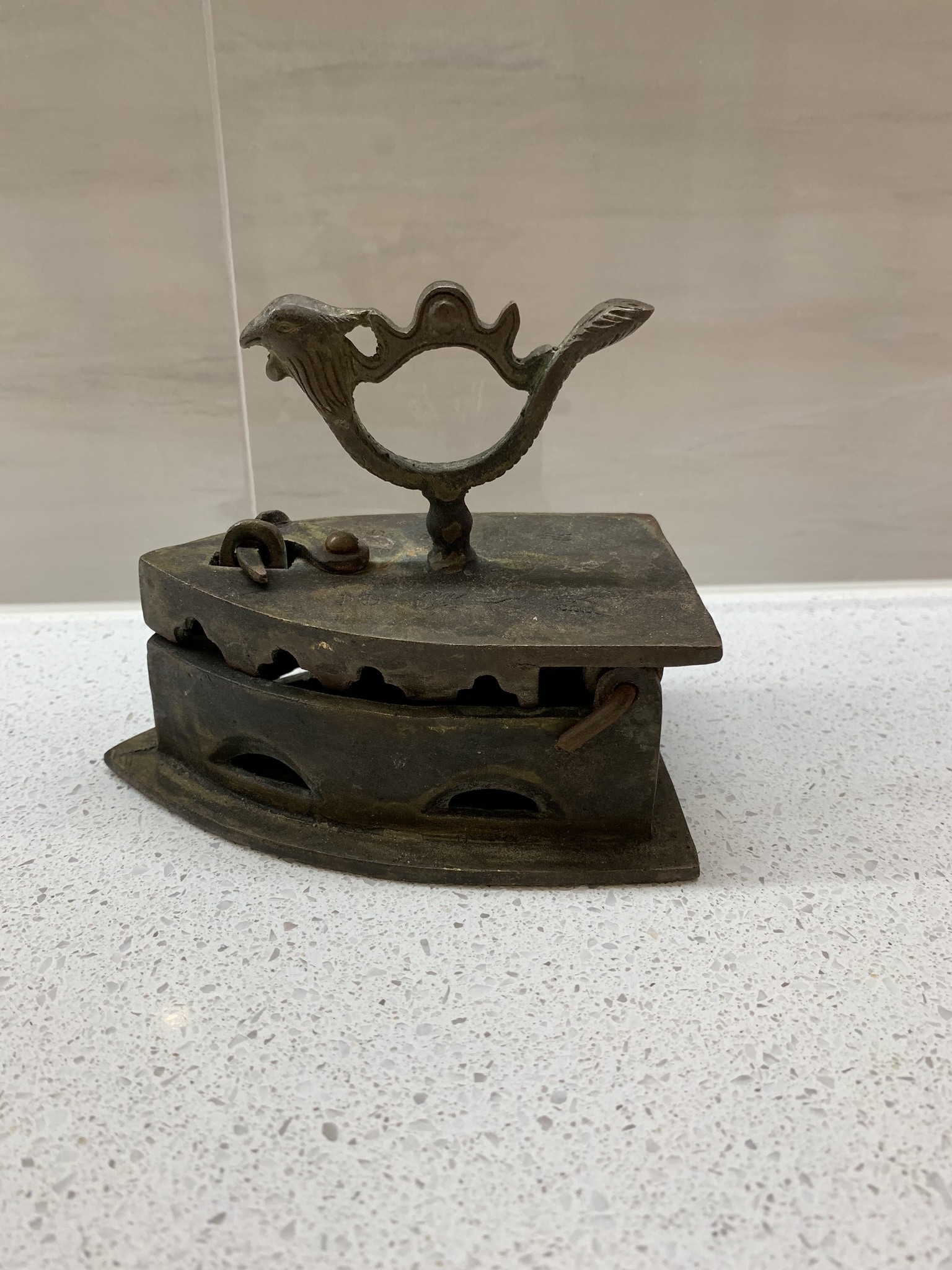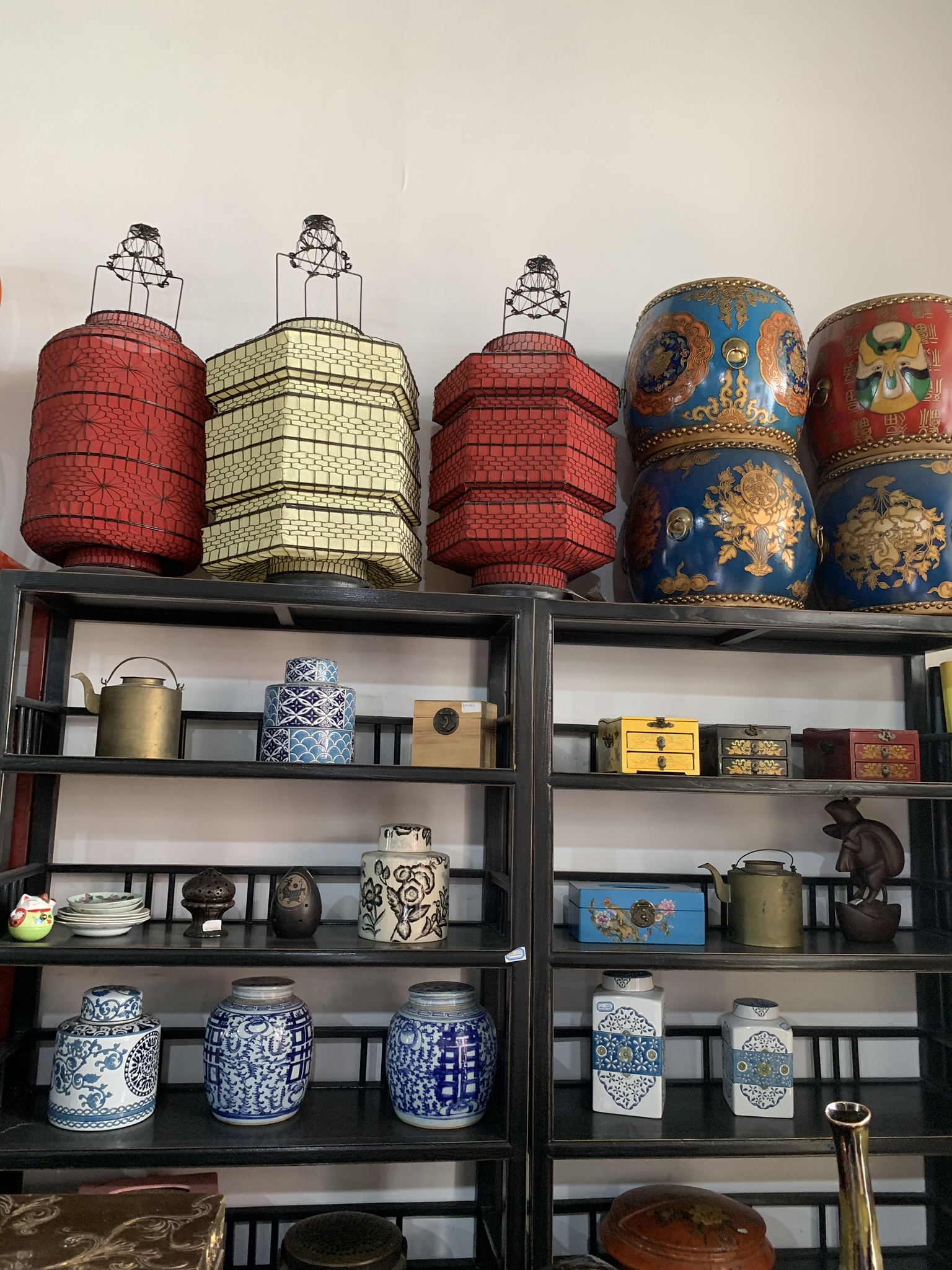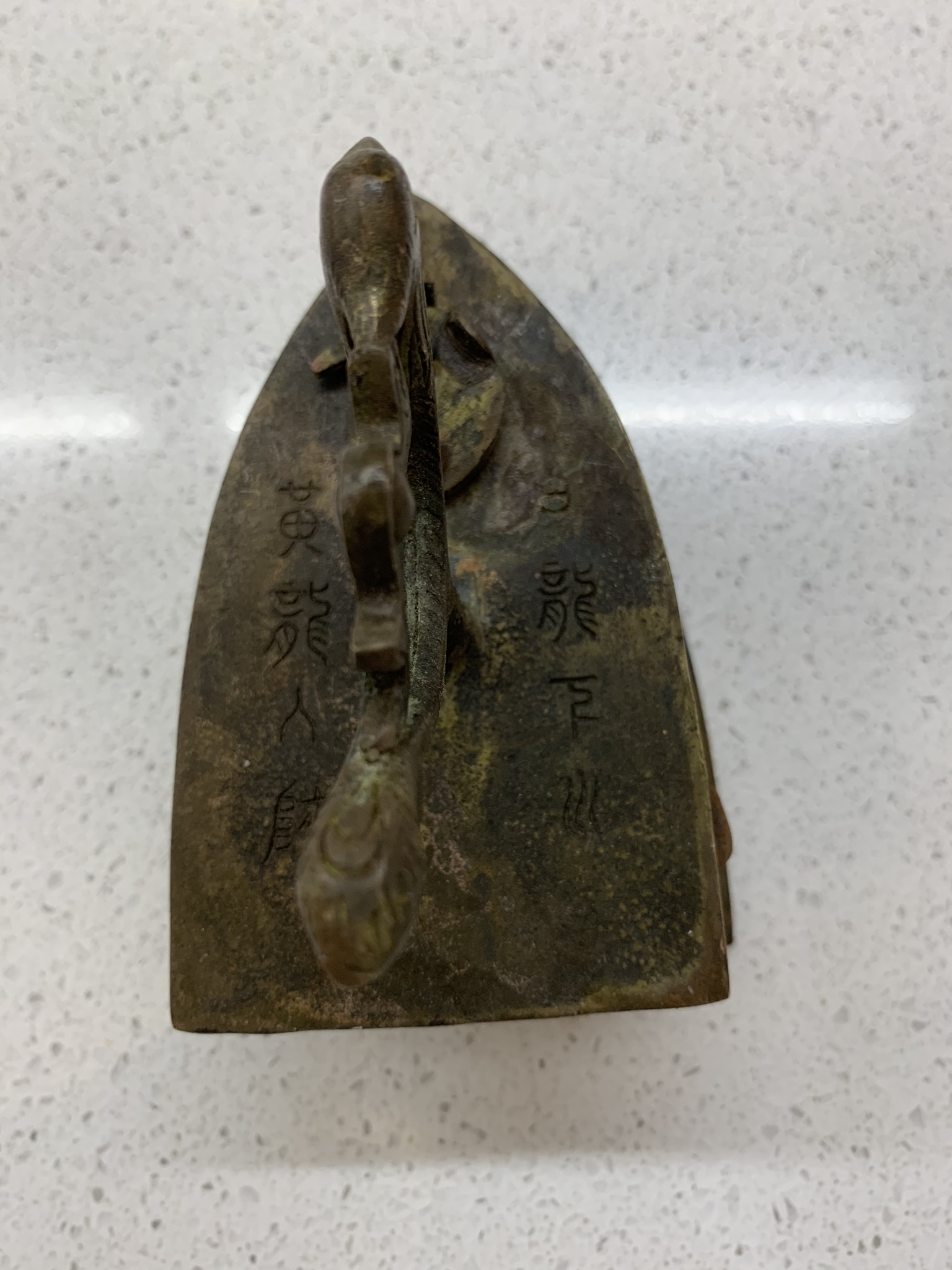 If you look on the top shelf there is a little iron. I picked it up at The Cat Street Market in Hong Kong for $10 CAD, after haggling a bit, of course. It is the cutest thing and I just love it! It has some writing on it that I want to get someone to translate and it opens up so you could put hot coals in it so it can be used as an iron.