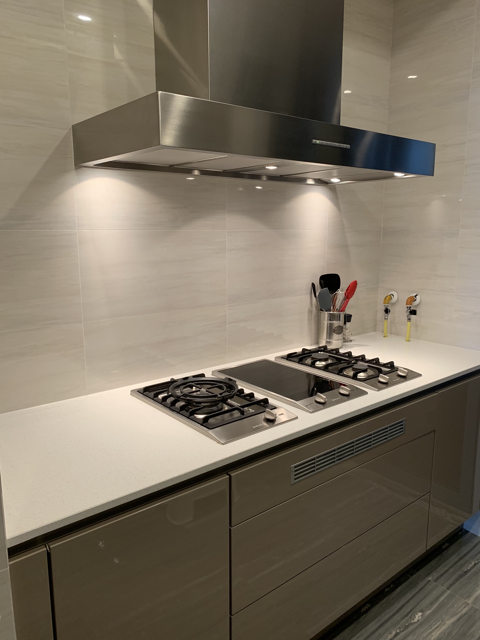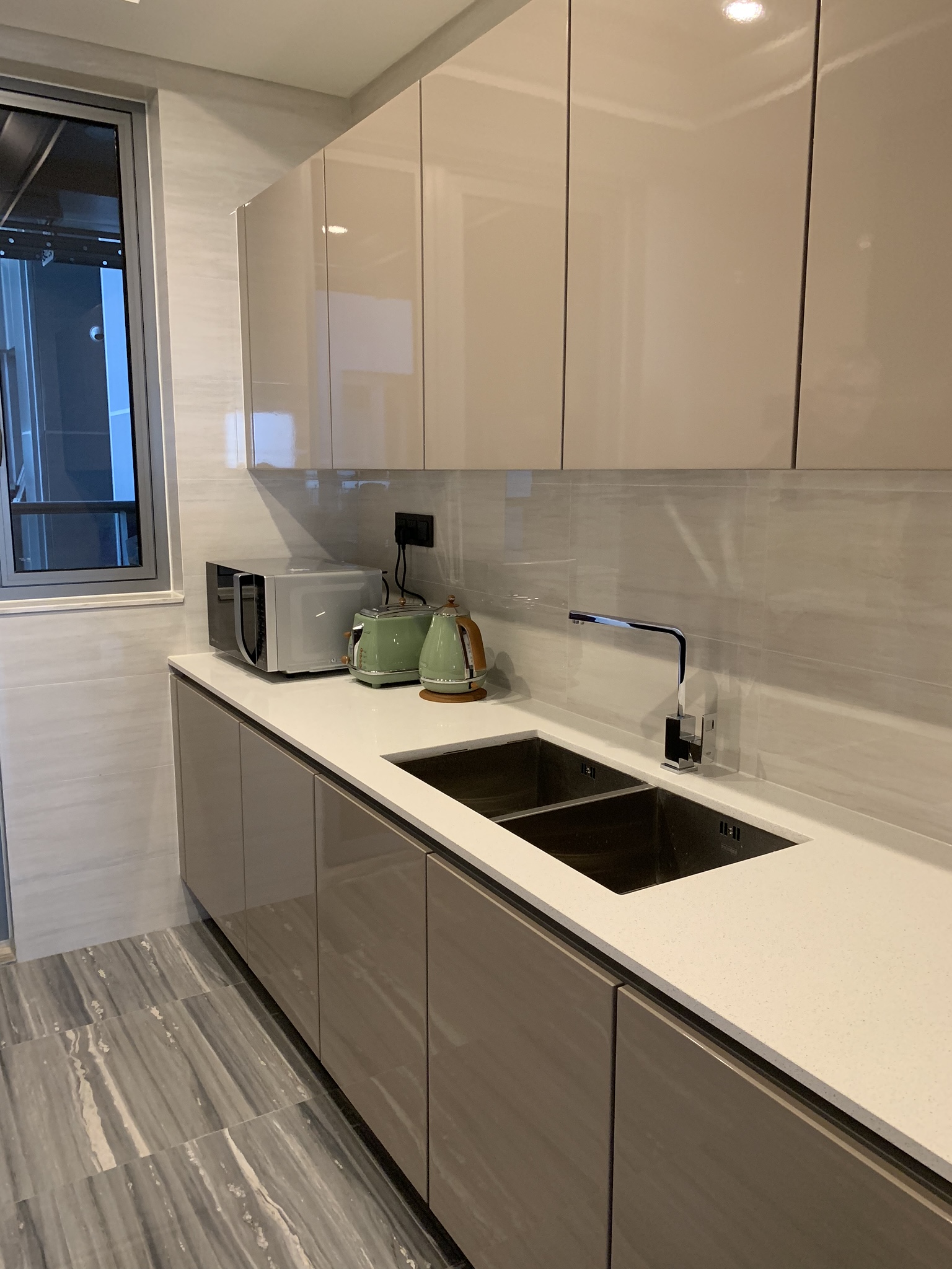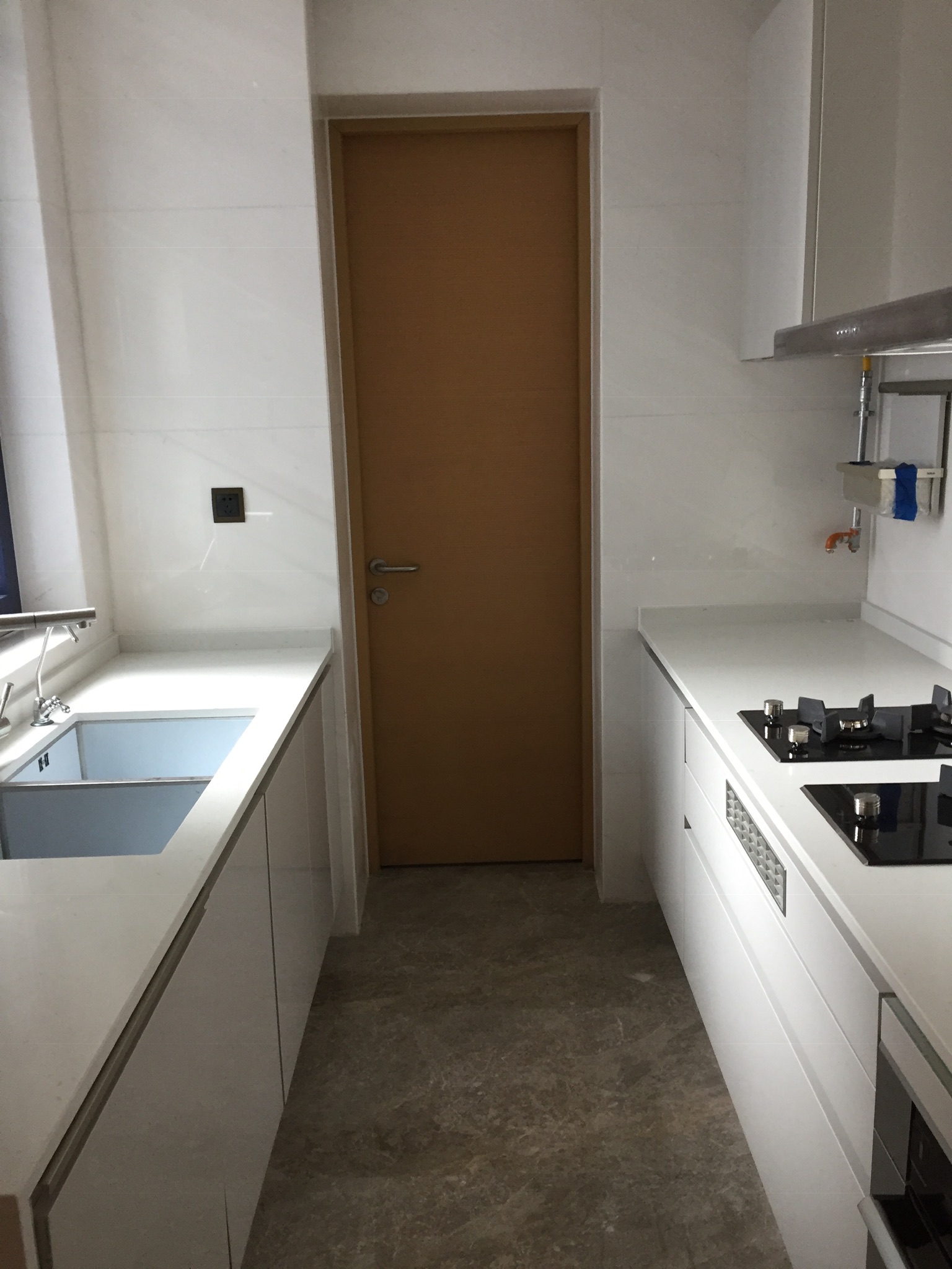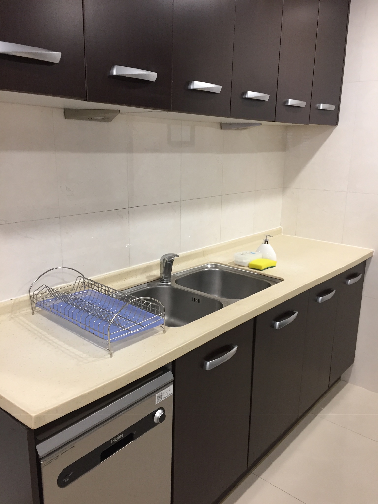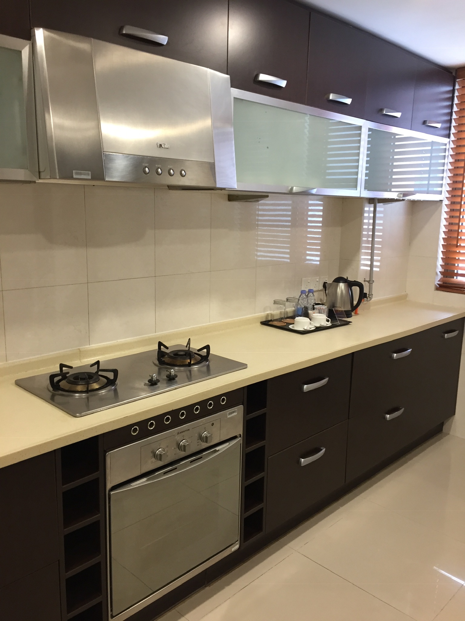 The galley kitchen with a wok ring, two burner ceramic surface element and two gas burners. Across the way is the microwave, complete with a dumpling button, toaster and kettle at the only outlet in the kitchen. There is also a concealed dishwasher to the right of the sink.