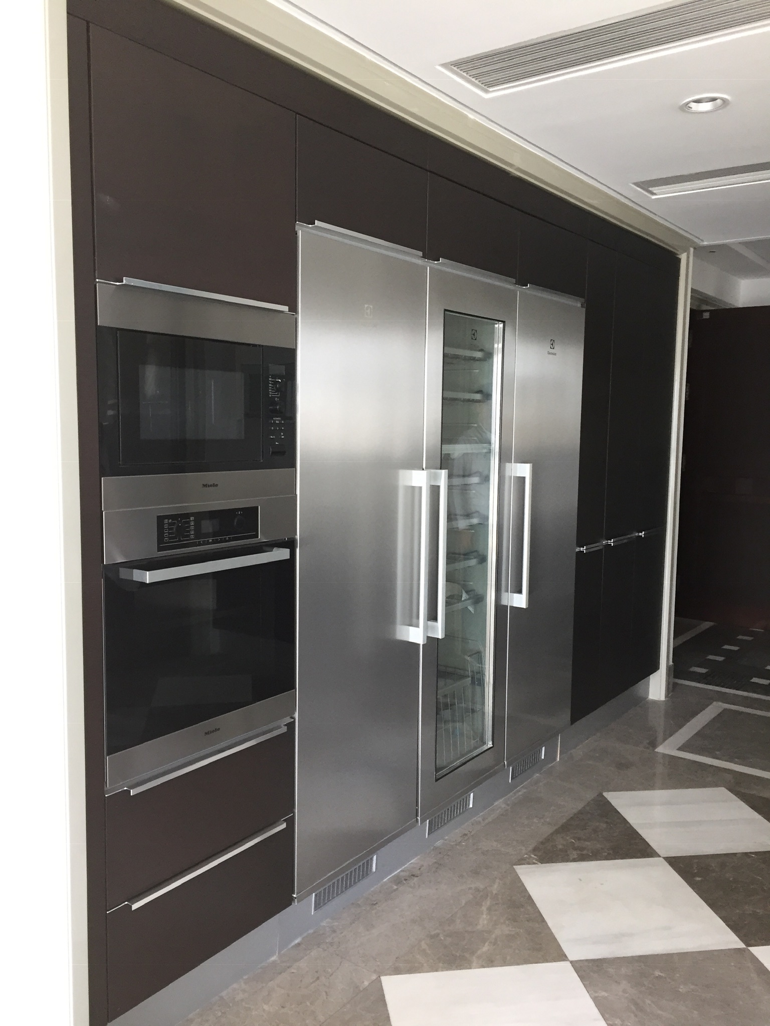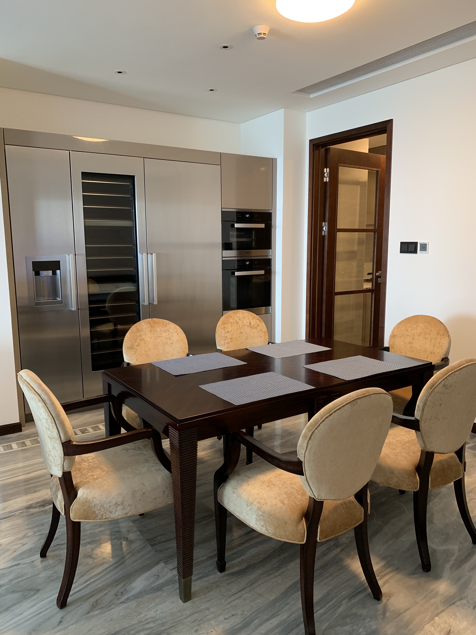 Coming out of the kitchen through the door is the rest of the kitchen and the dining room. The wall of appliances has a steam oven and a regular oven which I think will fit a 15lb turkey if I happen to cook Christmas or Thanksgiving dinner. A full sized fridge and freezer and a mammoth sized wine fridge which is totally lost on us!