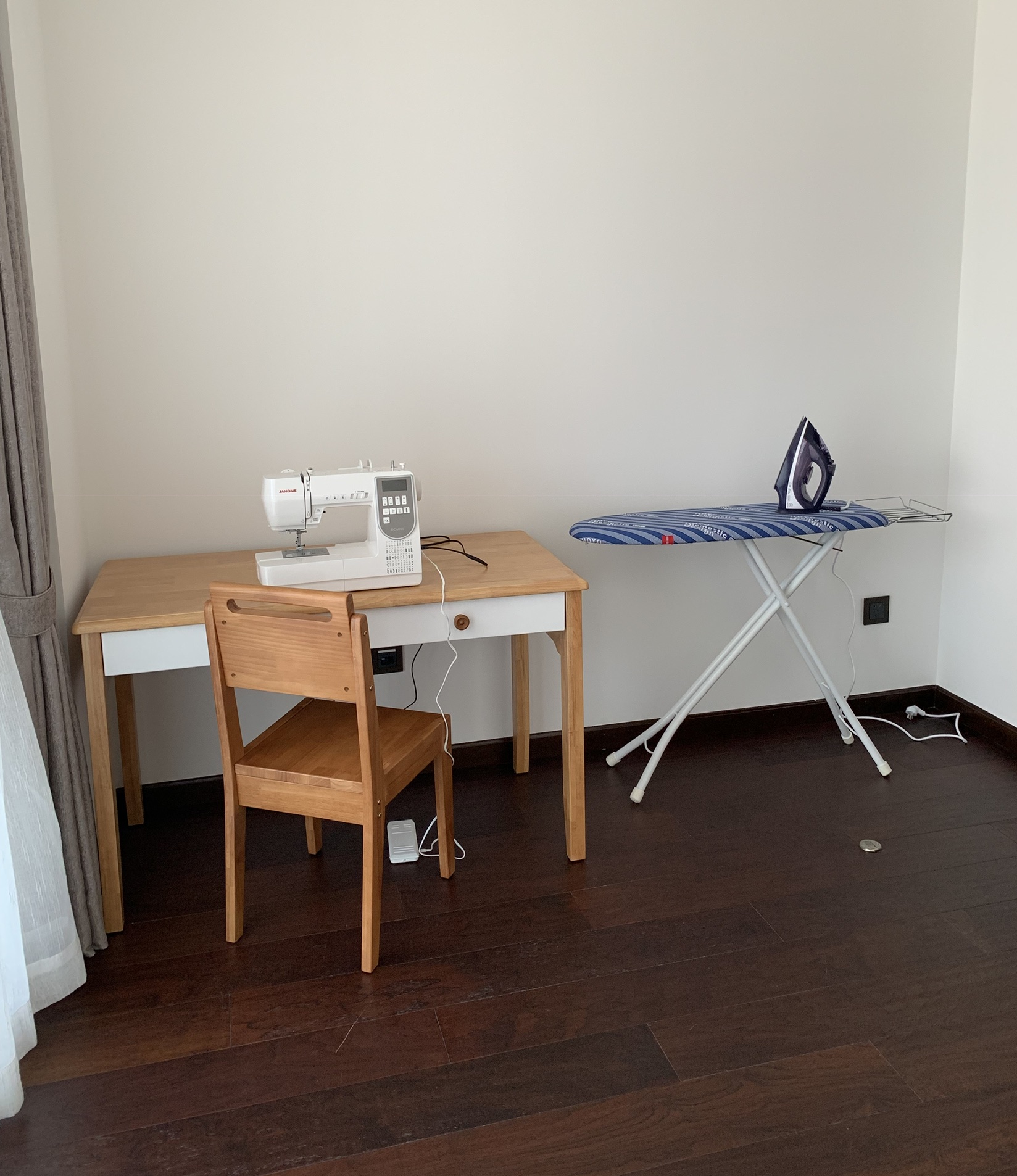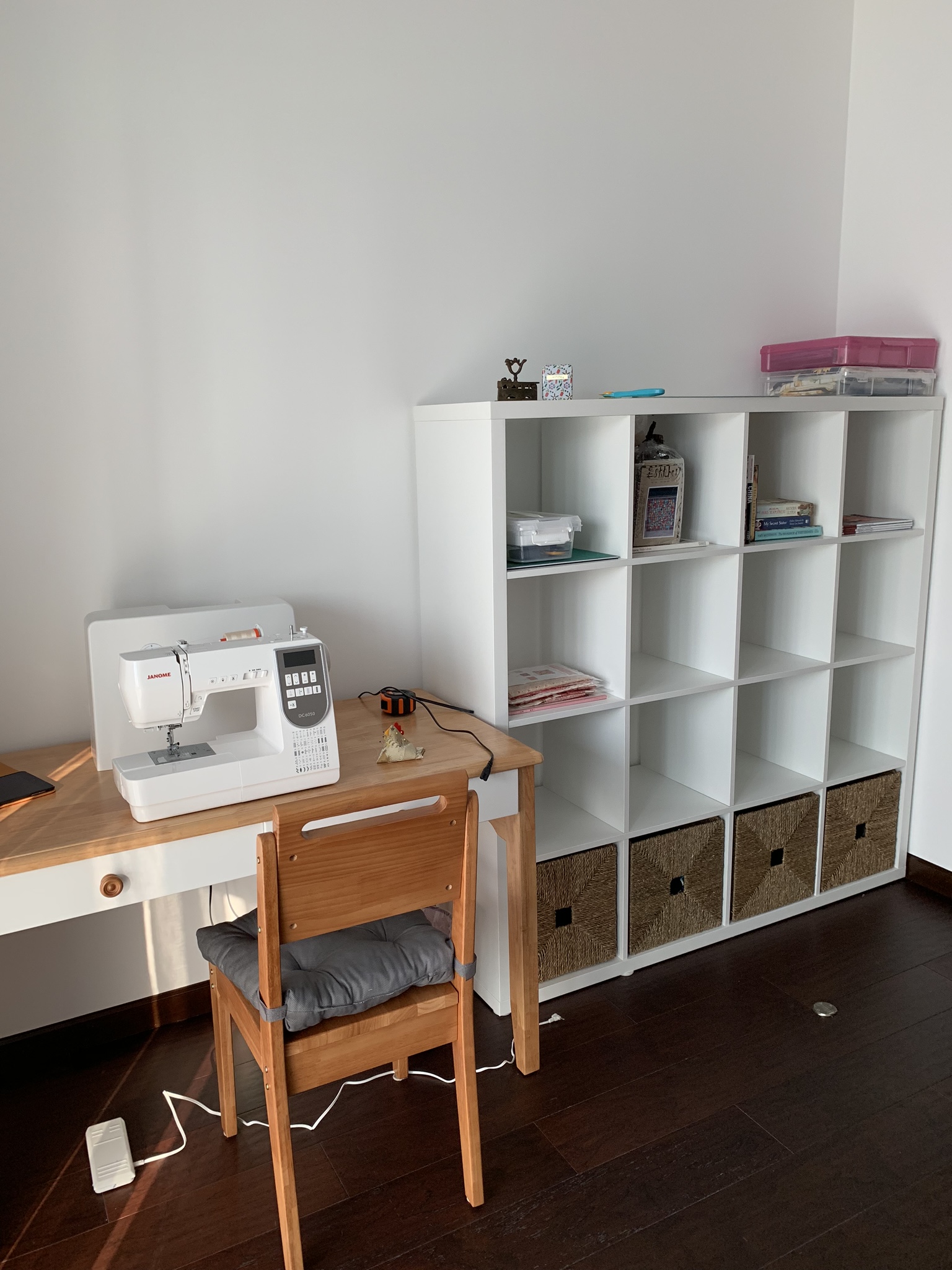In my previous post I showed you my very sparse sewing space. I have since added a shelf from IKEA . I think it looks great and couldn’t have fit better in the space.