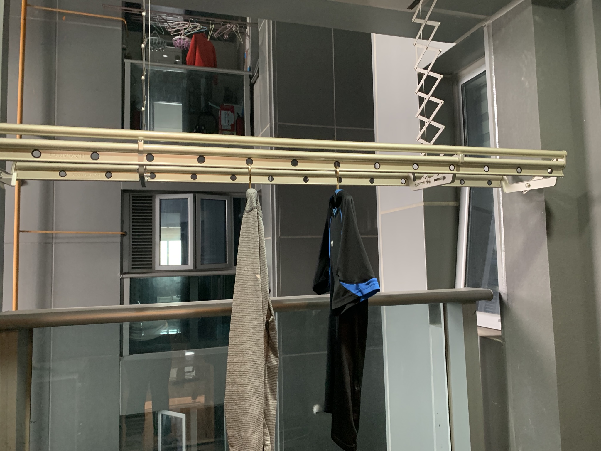 Just outside the kitchen there is a mini balcony where the washing machine is located. Yes outside! The gold thing is a clothes drying rack that raises and lowers with a remote control. Yes remote control! And across the way…are the neighbours!